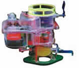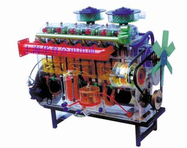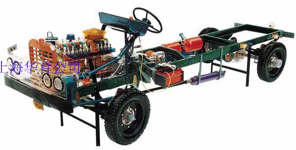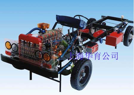 本品選用透明有機玻璃制作,內(nèi)中部件均以硬質(zhì)塑料料加工,用 螺絲固定在金屬高溫烘漆而成的車架上。各總成部分都以壓模成形加 工,代替過去膠粘合的方法,使產(chǎn)品在強度上有很大提高。發(fā)動機總成用電機驅(qū)動,在油門處設(shè)有調(diào)速裝置,能演示發(fā)動機轉(zhuǎn)速高低。離合器分離明顯,操縱靈活,離合器外殼整體壓模而成,變速箱和各檔齒輪用各種顏色表示,換檔靈活,手制動美觀。后橋外形壓模而成,內(nèi)中主減速、差速轉(zhuǎn)動自如,輪轂剎蹄壓模成型,剎蹄可調(diào)節(jié),前橋輪鼓可調(diào)整,轉(zhuǎn)向裝置以及電瓶、油箱、水箱,制動管路分布清楚一目了然。電路采用對插件前后分布,燈架、風(fēng)窗、儀表板、后燈架用透明有機玻璃壓模成整體美觀逼真。