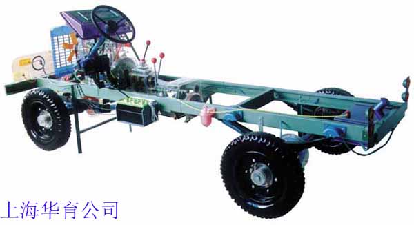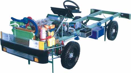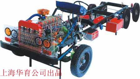 本品選用透明有機(jī)玻璃制作,內(nèi)中部件均以硬質(zhì)塑料料加工,用 螺絲固定在金屬高溫烘漆而成的車架上。各總成部分都以壓模成形加 工,代替過去膠粘合的方法,使產(chǎn)品在強(qiáng)度上有很大提高。發(fā)動(dòng)機(jī)總成用電機(jī)驅(qū)動(dòng),在油門處設(shè)有調(diào)速裝置,能演示發(fā)動(dòng)機(jī)轉(zhuǎn)速高低。離合器分離明顯,操縱靈活,離合器外殼整體壓模而成,變速箱和各檔齒輪用各種顏色表示,換檔靈活,手制動(dòng)美觀。后橋外形壓模而成,內(nèi)中主減速、差速轉(zhuǎn)動(dòng)自如,輪轂剎蹄壓模成型,剎蹄可調(diào)節(jié),前橋輪鼓可調(diào)整,轉(zhuǎn)向裝置以及電瓶、油箱、水箱,制動(dòng)管路分布清楚一目了然。電路采用對插件前后分布,燈架、風(fēng)窗、儀表板、后燈架用透明有機(jī)玻璃壓模成整體美觀逼真。