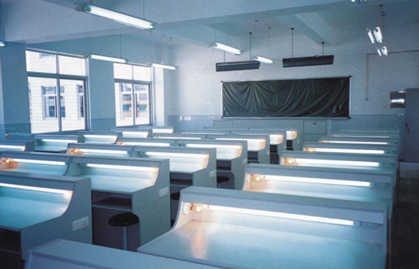 1、 采用電子日光燈,兩人一組,由教師主控臺(tái)分組控制,并選用漏電保護(hù)裝置,使220V交流電源到位。