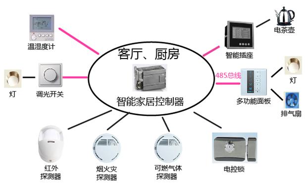 智能電子產品系統網絡示意圖 1. 家庭控制中心說明: 客廳廚房控制中心 客廳廚房控制中心包含智能家居控制器、電控鎖、多功能面板、節(jié)能燈、排氣扇、智能調光開關、智能光強及溫濕度計、智能插座、電茶壺、可燃氣體探測器、煙火災探測器及紅外探測器。 電控鎖通過智能家居控制器控制門的開啟;多功能面板控制客廳、廚房燈的開關;智能調光開關調節(jié)LED燈的亮度、也可通過485總線與智能家居控制器通訊,通過情景模式智能調節(jié)LED燈的亮度;智能光強及溫濕度計顯示采集客廳溫濕度及光照度;智能插座控制和采集電茶壺的電源和電量信息,可合理分配用電負荷;可燃氣體探測器、煙火災探測器及紅外探測器用于組件家居系統的安防系統。 多功能面板、智能調光開關、智能光強及溫濕度計、智能插座通過485總線與智能家居控制器通訊,可燃氣體探測器、煙火災探測器、紅外探測器及電控鎖通過I\O口與智能家居控制器通訊。