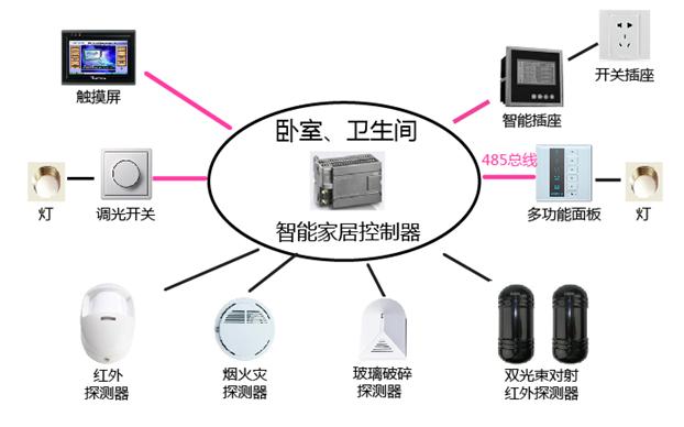 智能電子產品系統客廳廚房安裝配置圖 臥室衛(wèi)生間控制中心 臥室衛(wèi)生間控制中心包含智能家居控制器、觸摸屏、多功能面板、智能調光開關、智能插座、煙火災探測器、紅外探測器、玻璃破碎探測器、雙光束對射紅外探測器。 觸摸屏通過485與智能家居控制器通訊,可實現遙控、遙信、遙調及情景模式的設定;智能調光開關調節(jié)白熾燈的亮度、也可通過485總線與智能家居控制器通訊,通過情景模式智能調節(jié)白熾燈的亮度;多功能面板控制臥室、衛(wèi)生間燈的開合;智能插座控制和采集相關用電設備電源和電量信息,可合理分配用電負荷;煙火災探測器、紅外探測器、玻璃破碎探測器、雙光束對射紅外探測器用于組件家居系統的安防系統。 觸摸屏、多功能面板、智能調光開關、智能插座通過485總線與智能家居控制器通訊,煙火災探測器、紅外探測器、玻璃破碎探測器及雙光束對射紅外探測器通過I\O口與智能家居控制器通訊。